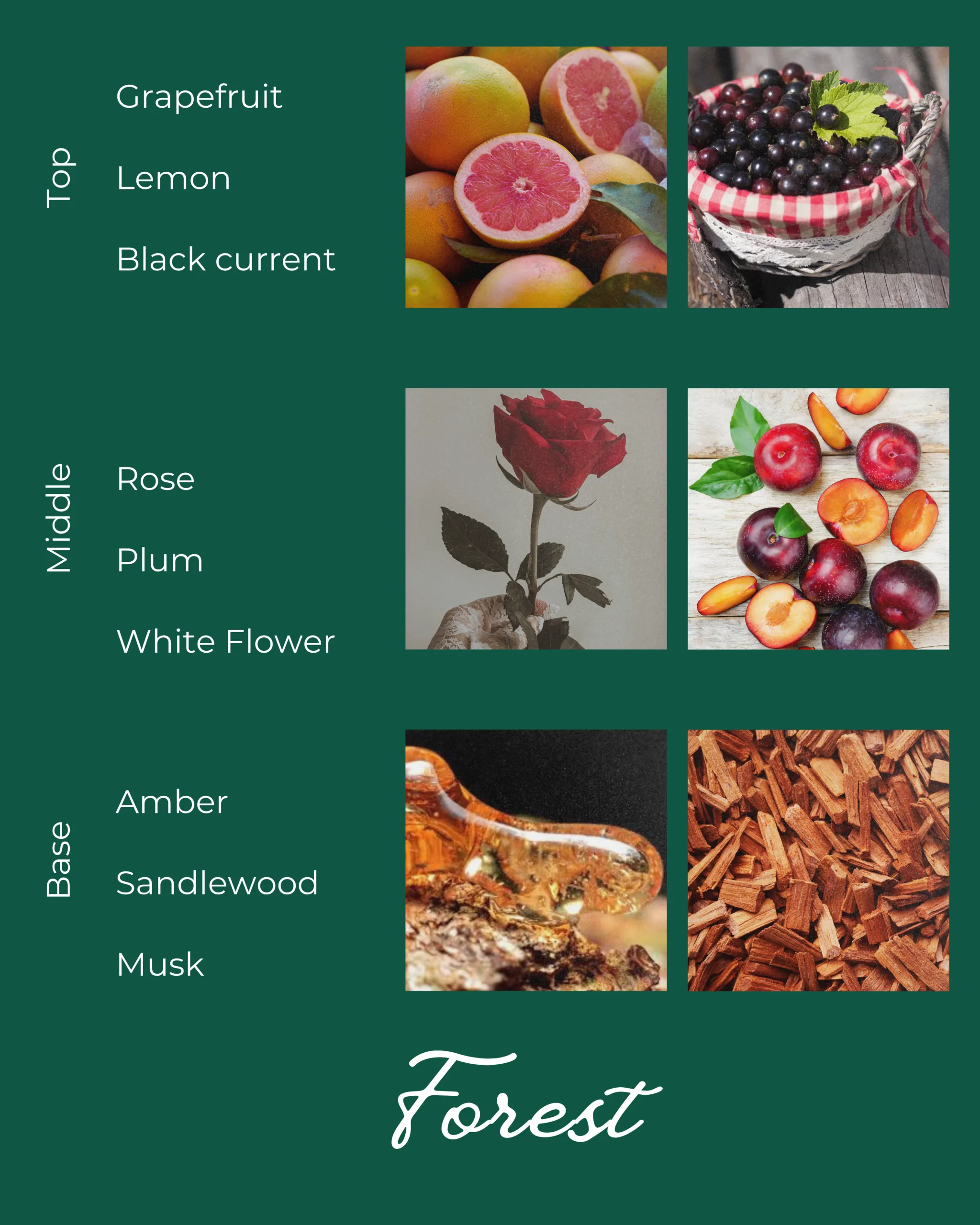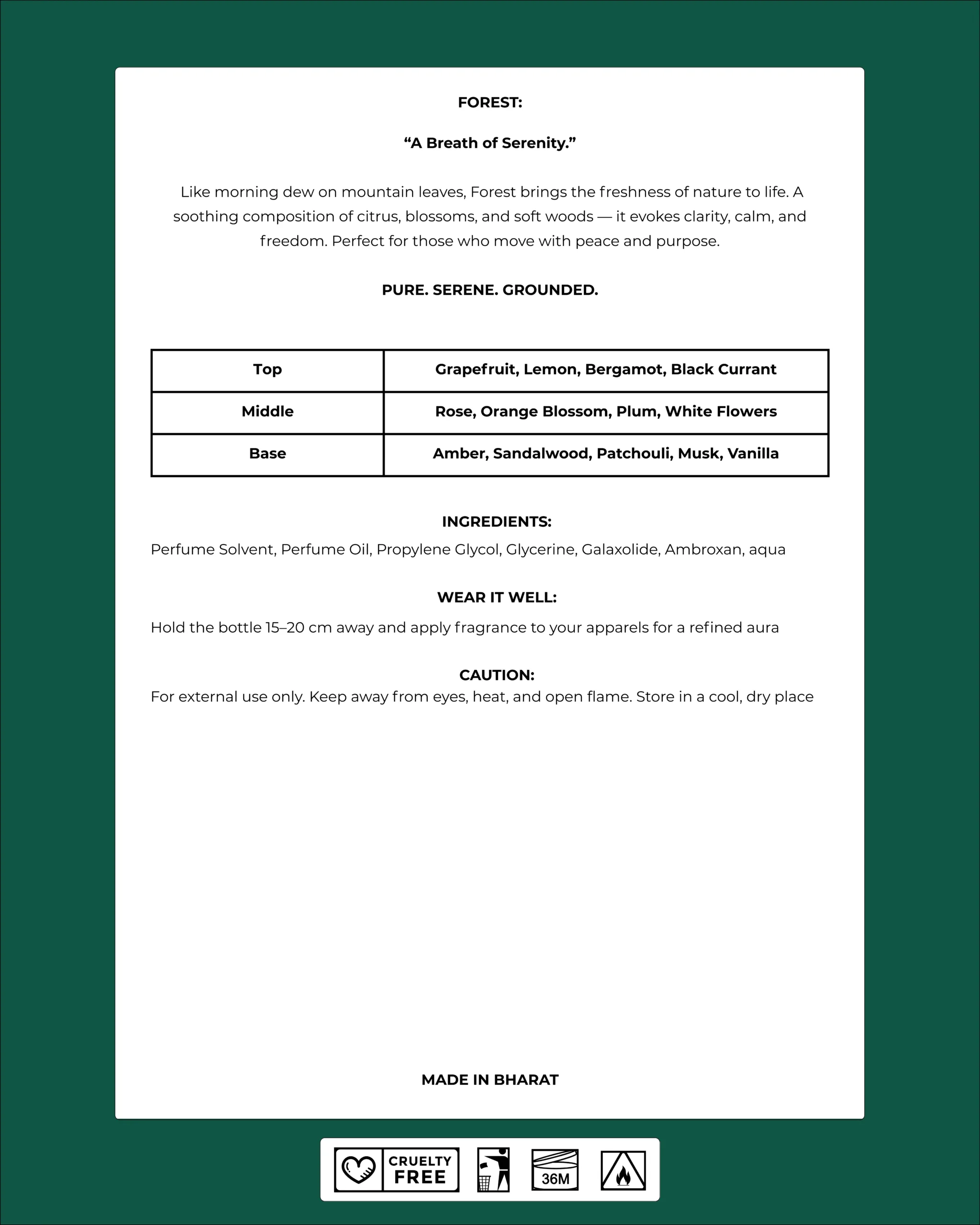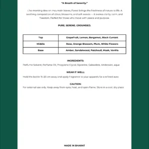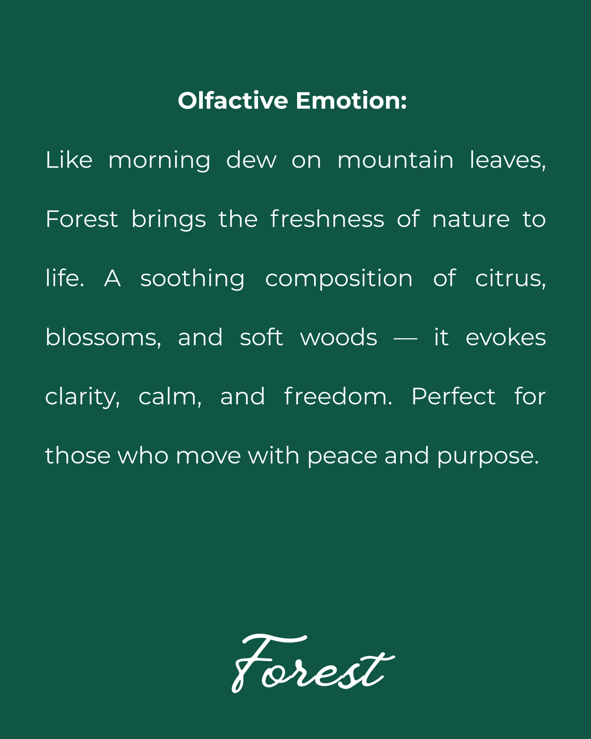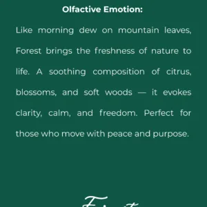 Forest is a fresh and calming Eau de Parfum inspired by nature at dawn. Bright citrus, gentle florals, and soft woods come together to create a scent that feels clean, grounding, and free. Refreshing yet comforting, Forest is made for clarity of mind and calm confidence.