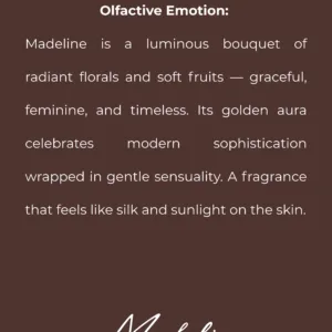 Madeline is a luminous Eau de Parfum where radiant florals and soft fruits come together in perfect harmony. Graceful, feminine, and timeless, it wraps the skin in a golden glow of elegance. Light yet memorable, Madeline feels like silk and sunlight — gentle, confident, and beautifully composed.